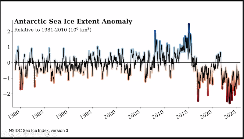 “Certainly, what we’re seeing is that winter reset…doesn’t seem to be happening anymore,” said Will Hobbs, an Australian Antarctic Program sea ice scientist.